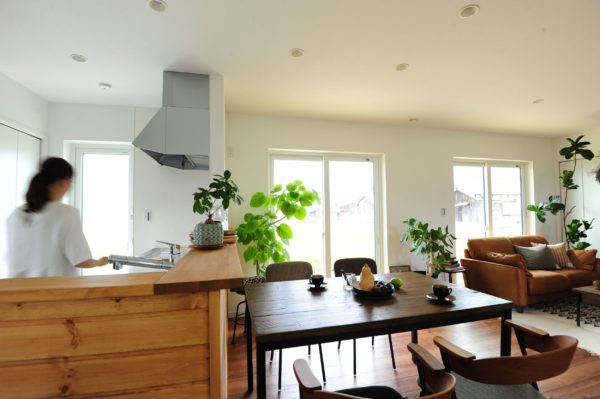 板張りのオープンキッチンは料理をしながらリビングにいる家族と対話することができます。
