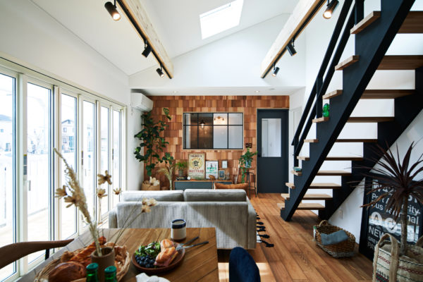 大きな窓とトップライトからは、心地の良い光がリビングへ差し込み、開放的な空間が広がります。廊下を無くし各部屋へはリビングを通るようにすることで、自然と家族が顔を合わせるのでコミュニケーションも◎