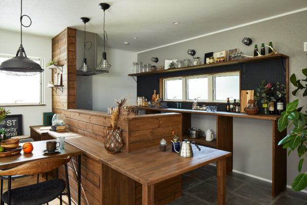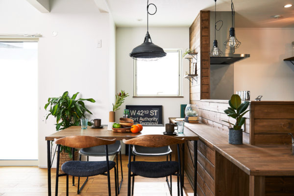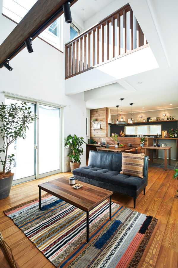 リビング壁にブリックタイルがアクセントの印象的な自然素材の家。ダイニング壁面には無垢板張り、LDK全体的にヴィンテージな風合いをナチュラルに楽しめる空間に仕上げました。広々とした吹き抜けから日差しが差し込み、毎日の暮らしを十分に楽しませてくれます。