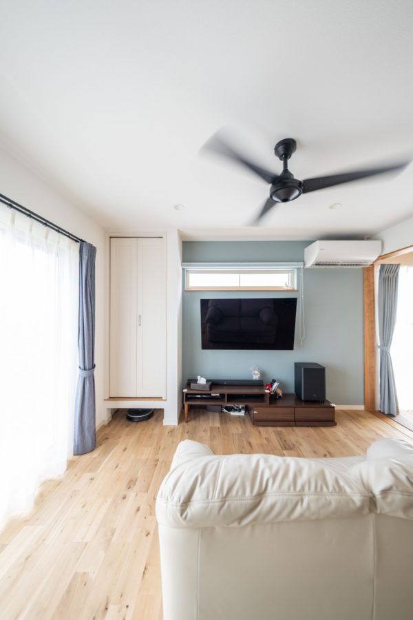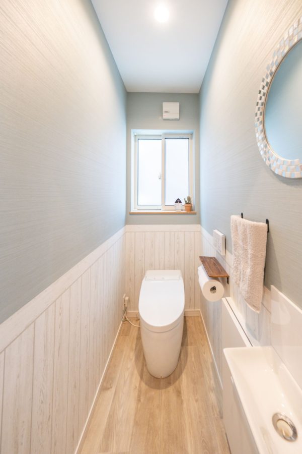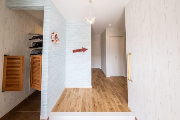 木目調のクロスやパステルカラーのリビングドア、アクセントクロスをうまくコーディネートしてアクセントカラーの水色がよく似合う可愛いお家です。