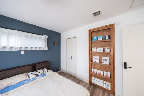 主寝室にある本棚はご主人の書斎につながる扉で遊び心も◎