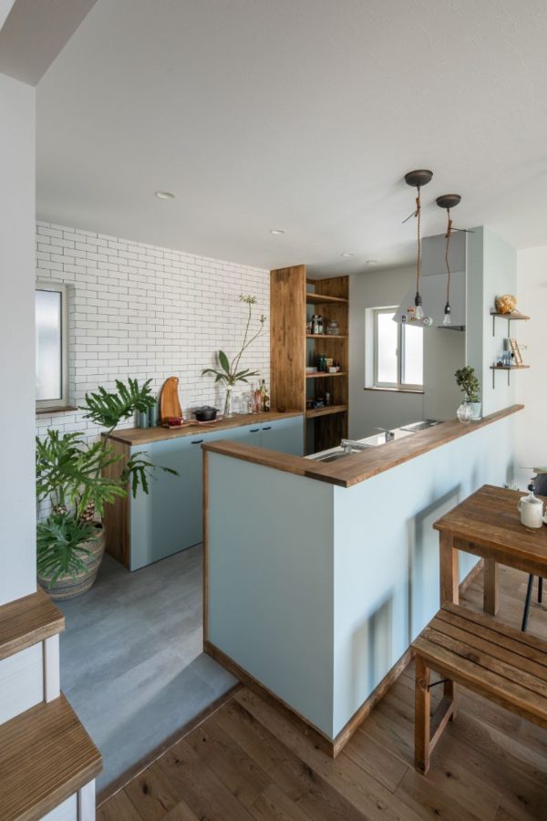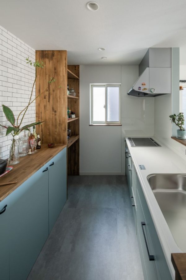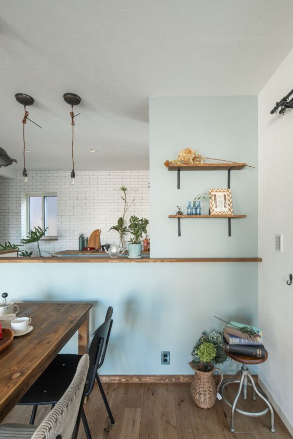 こだわりのタイル調クロスや爽やかなパステルブルーのクロスが可愛い雰囲気。
