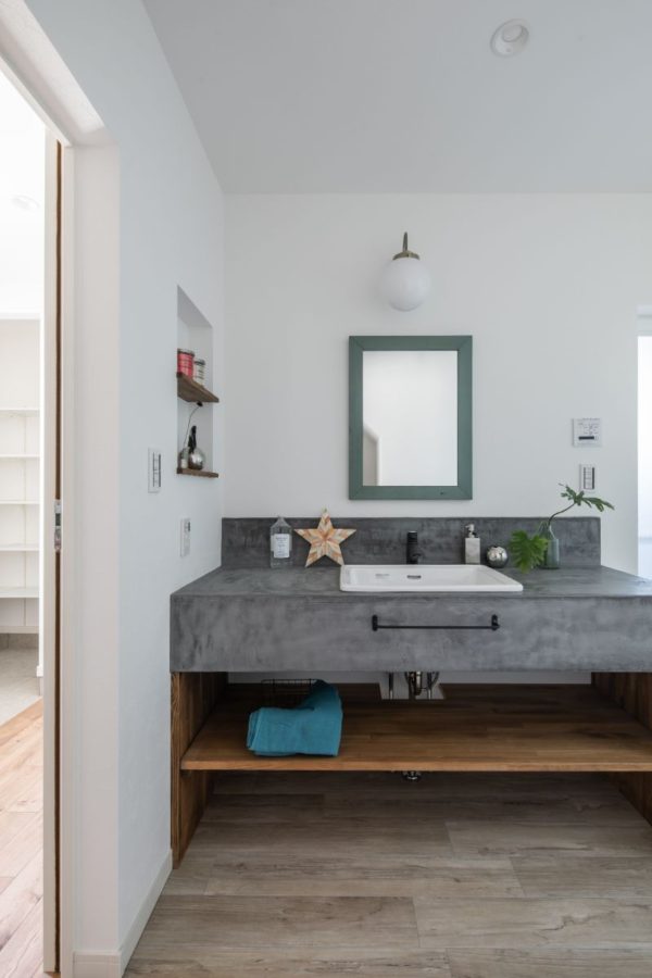 モールテックス仕上げのおしゃれな洗面は間口が広いので、家族のコミュニケーションも