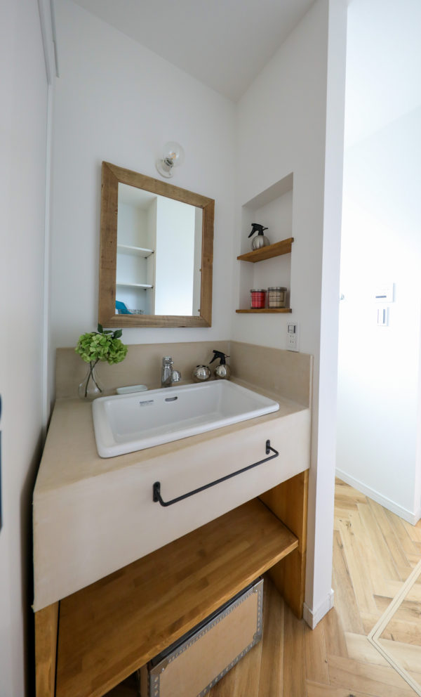 モールテックスの造作洗面や、アイアンの手すりを使ったリビング階段などこだわりを詰め込んだお部屋です。