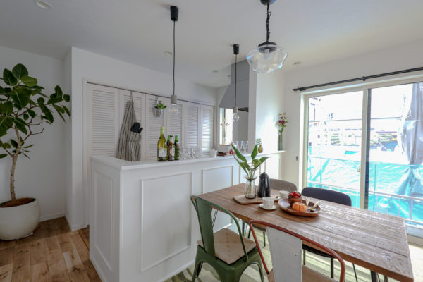 こだわりの白いカラーを使ったモールディングのキッチンカウンターに隠せる収納が真似したいキッチンスペース。