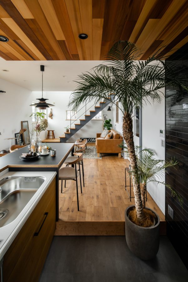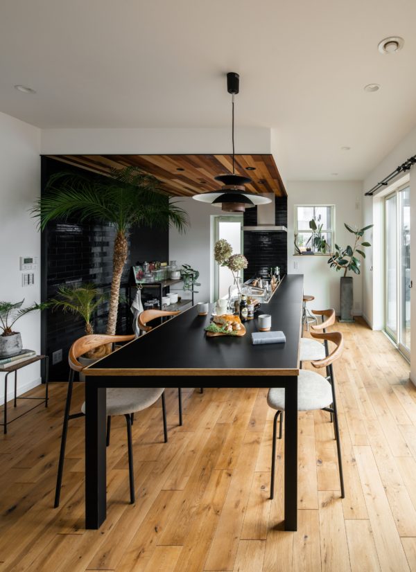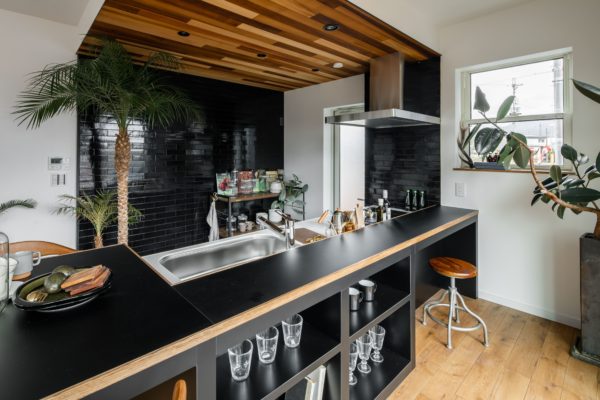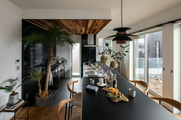 中は黒で統一されたキッチンとダイニングカウンターが目を惹きます。