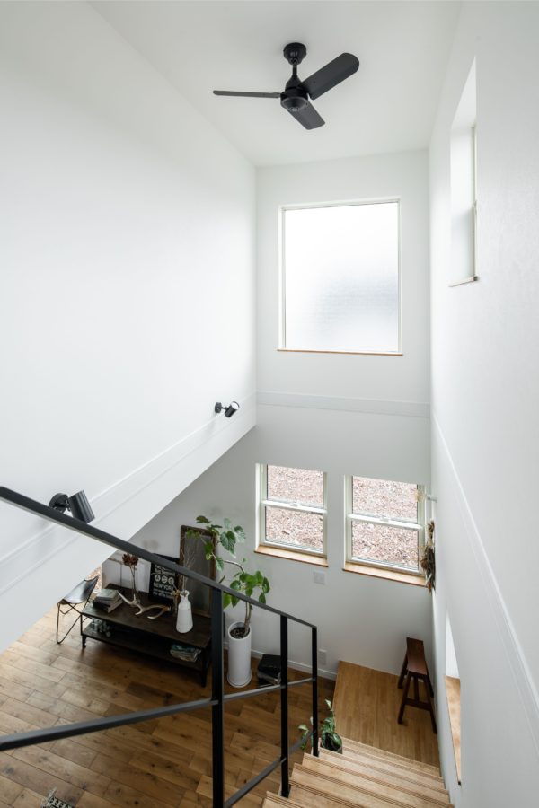 リビングには吹抜け階段があり明るさも抜群。グレーとアイアン手摺を使った階段は黒で統一したキッチンにもよく合います。